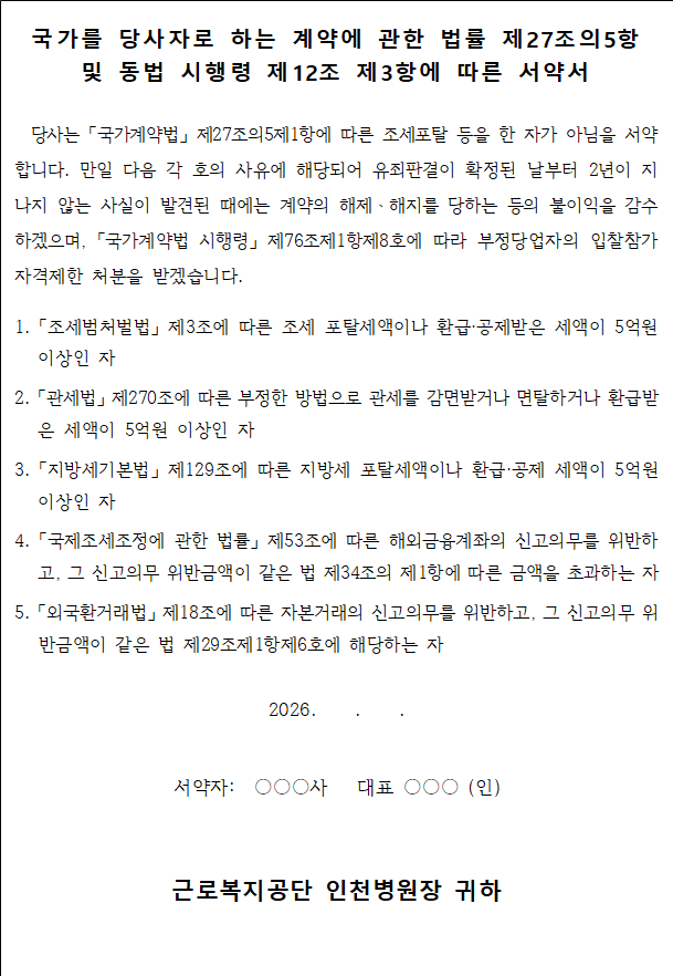 당사는 근로복지공단에서 시행하는( ) 계약업체로서 입찰·계약 및 계약의 이행에 있어 깨끗하고 투명한 기업문화의 조성과 인권존중·보호의 가치를 실현하는 윤리적 기업으로서의 실천을 위해 다음 사항을 이행할 것을 서약합니다.