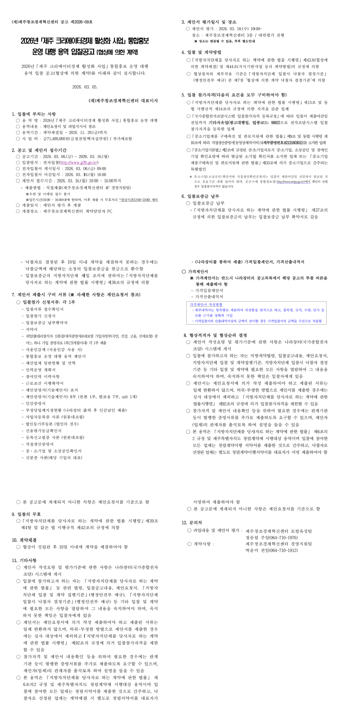 2026년 제주창조경제혁신센터「제주 크리에이터경제 활성화 사업」통합홍보 운영 대행 용역 |