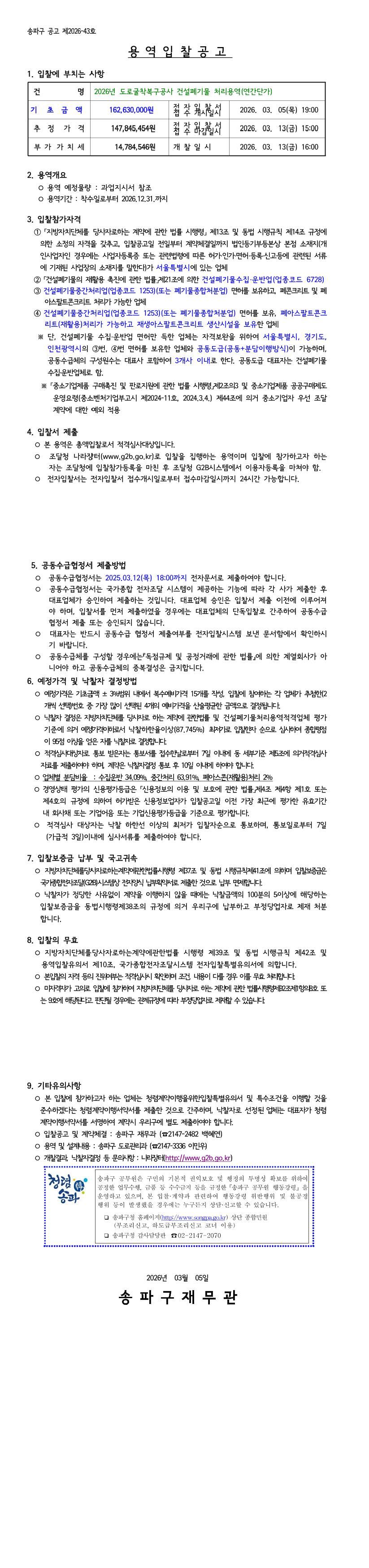 2026년 도로굴착복구공사 건설폐기물 처리용역(연간단가) |