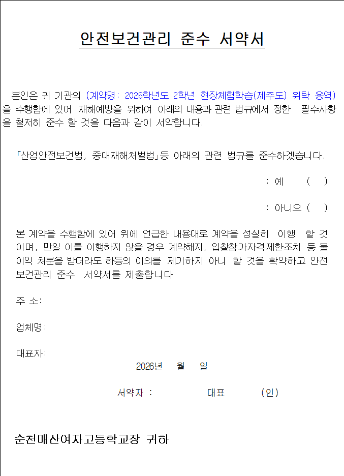 본인은 순천매산여자고등학교장의「2026학년도 2학년 현장체험학습(제주도) 위탁용역」업무를 수행함에 있어 다음 사항을 준수할 것을 엄숙히 서약합니다.
