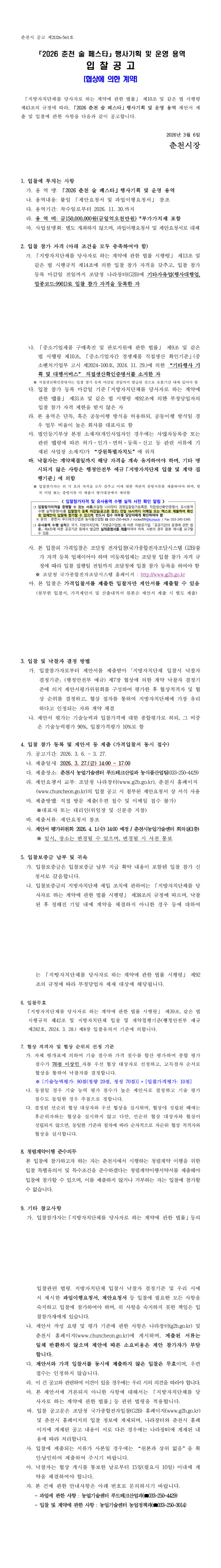 「2026 춘천 술 페스타」 행사기획 및 운영 용역 [협상에 의한 계약] |