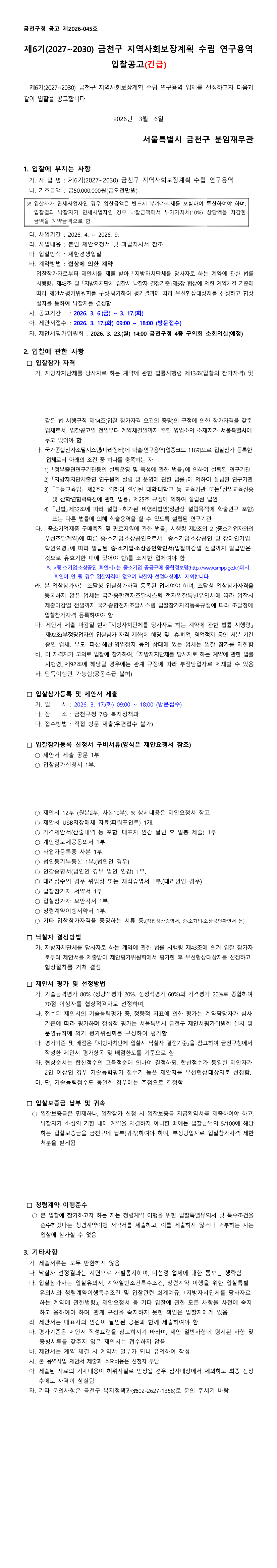(재공고) 제6기(2027~2030) 금천구 지역사회보장계획 수립 연구용역 |