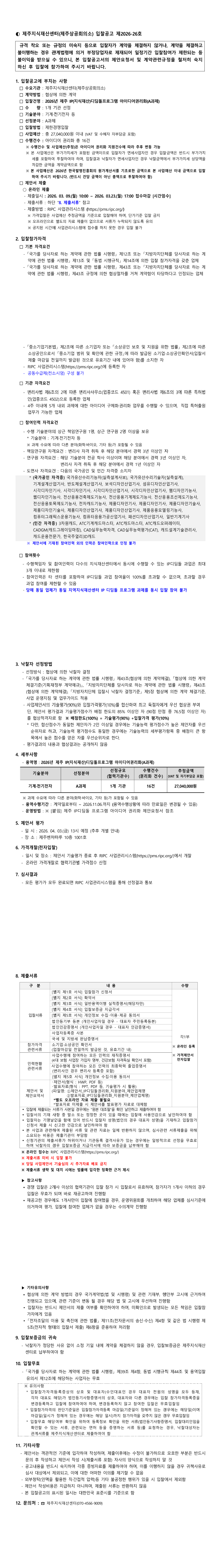 2026년 제주 IP디딤돌프로그램_아이디어권리화_입찰공고(A과제_기계전기전자) |
