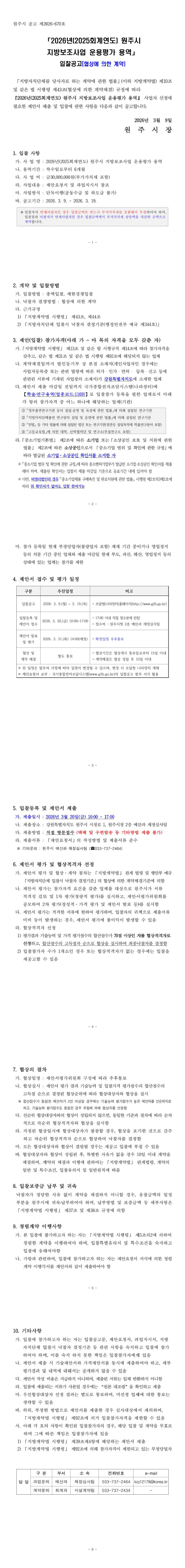 [협상에 의한 계약]2026년(2025회계연도) 원주시 지방보조사업 운용평가 용역 |
