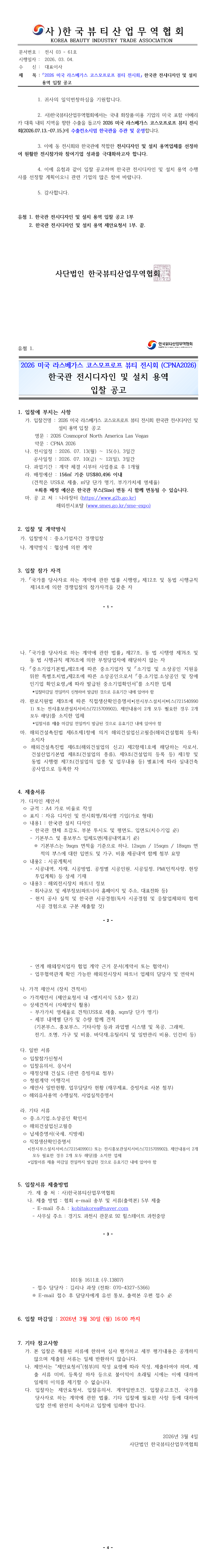 2026 미국 라스베가스 코스모프로프 뷰티 전시회 (CPNA2026) 한국관 전시디자인 및 설치 용역 입찰 공고 |