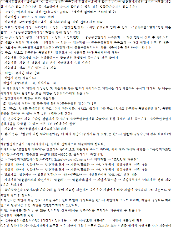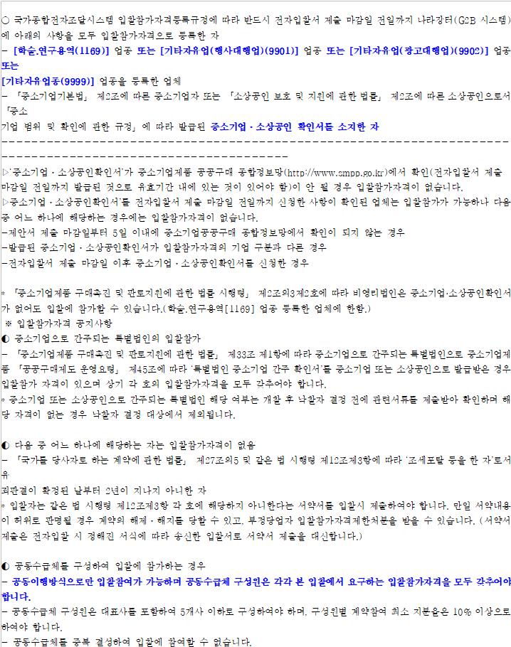 · 입찰에 참여하시기 전에반드시 공고서를 숙지하여 정확한 제한 업종을 확인하시기 바랍니다.