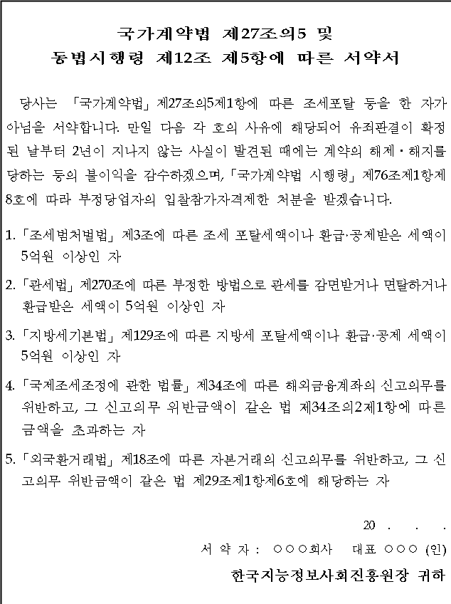 1. 금품․향응 등을 요구 또는 약속하거나 수수(授受)하지 않을 것이며, 관계공무원에게 금품, 향응 등을 제공한 경우에는 「국가를 당사자로 하는 계약에 관한 법률」제27조 제1항 제7호 또는 「지방자치단체를 당사자로 하는 계약에 관한 법률 시행령」제92조 제1항 제10호에 따른 부정당업자의 입찰참가자격 제한 처분을 받겠습니다.