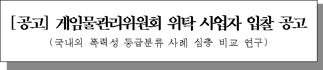 게임물관리위원회에서는 ‘국내외 폭력성 등급분류 사례 심층 비교 연구’ 위탁 사업자를 다음과 같이 모집합니다.