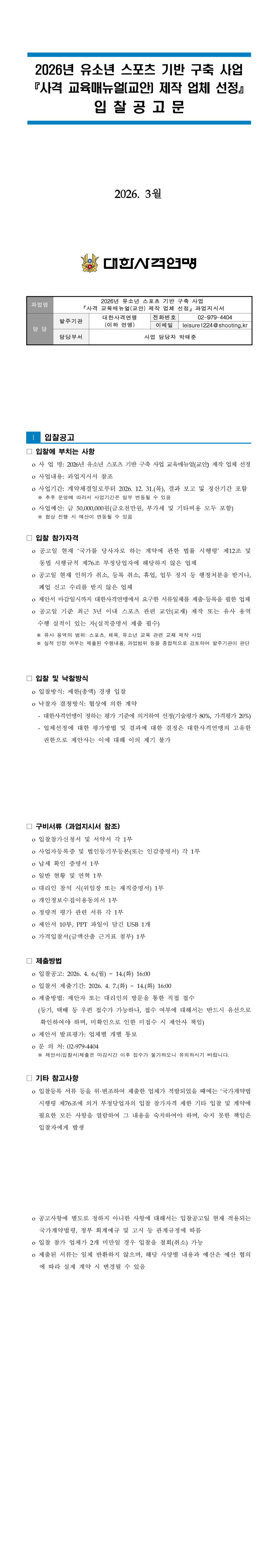2026년 유소년 스포츠 기반 구축 사업 사격 교육매뉴얼(교안) 제작 업체 선정 |