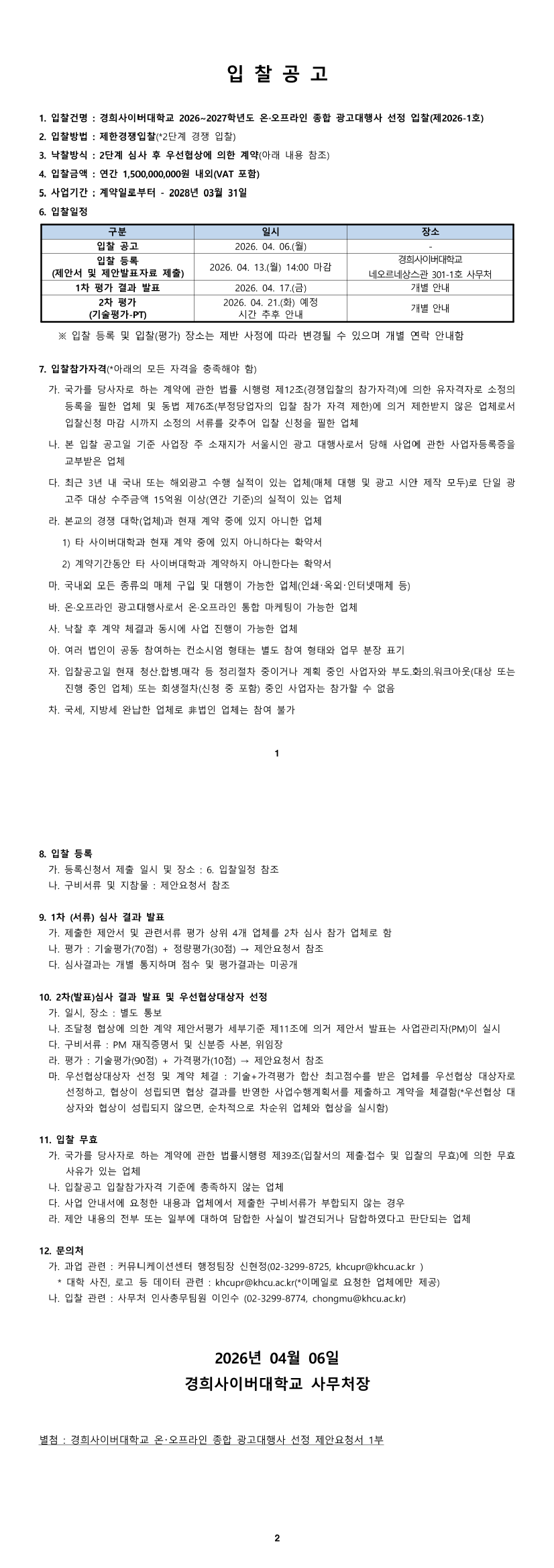 [취소 후 재공고] 경희사이버대학교 2026~2027학년도 온·오프라인 종합 광고대행사 선정 입찰(제2026-1호) |
