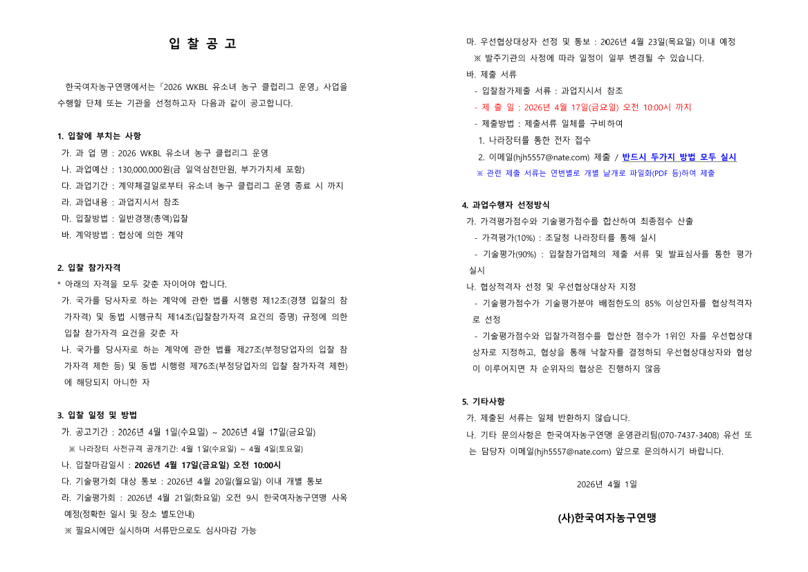 [긴급] 2026 WKBL 유소녀 농구 클럽리그 운영 |