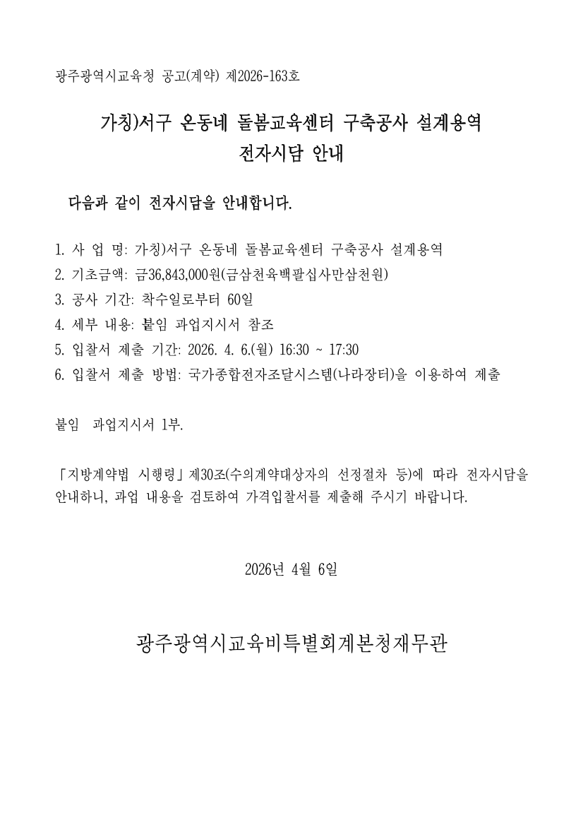 가칭)서구 온동네 돌봄교육센터 구축공사 설계용역 전자시담 안내 |