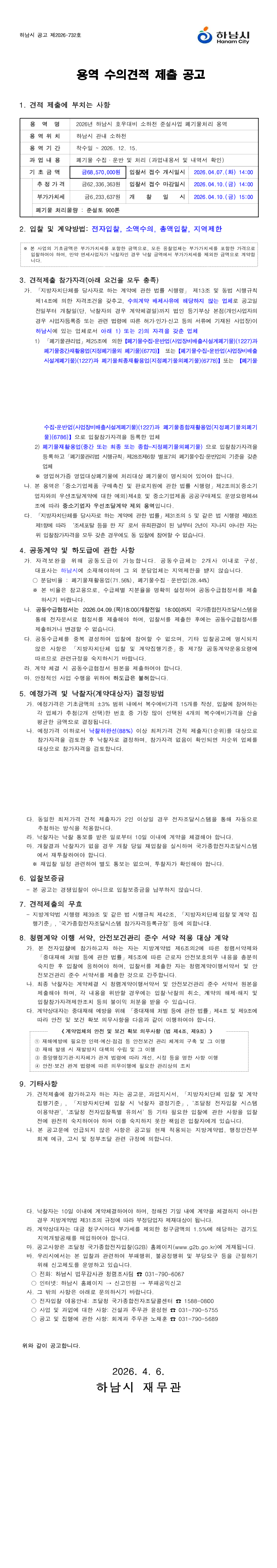 2026년 하남시 호우대비 소하천 준설사업 폐기물처리 용역 |