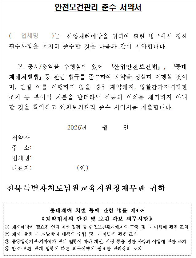 나. 본 입찰에 참가하고자 하는 자는 중대재해 예방을 위한 안전 및 보건 확보 의무사항을 숙지하신 후 입찰에 응하여야 하며, 계약 체결 시에 【붙임 3】「안전보건관리 준수 서약서」를 제출하여야 합니다.