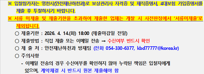 ○ 과업에 관한 문의사항 : 영천시 안전재난하천과 방재팀 (☏ 054-330-6377)