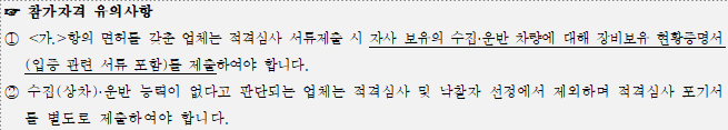 가. 폐기물관리법 제25조에 의거 각 목 중 1개 이상의 자격을 갖춘 업체로 수집(상차)·운반 능력(자체 차량보유)을 갖춘 업체
