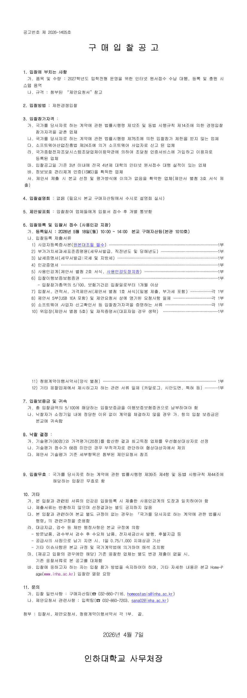 2027학년도 입학전형 운영을 위한 인터넷 원서접수 수납 대행, 등록 및 충원 시스템 용역 |
