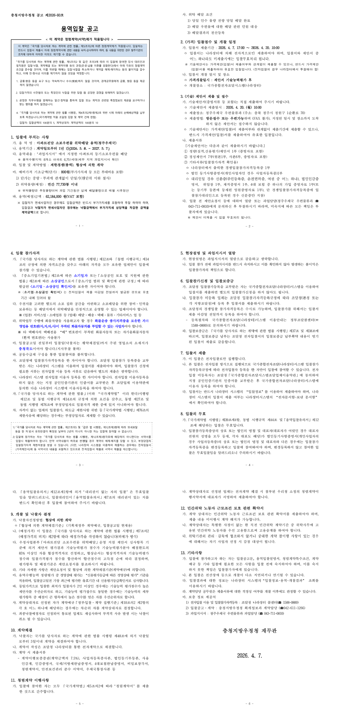 청주우체국 아파트전담 소포우편물 위탁배달 용역(재공고) |