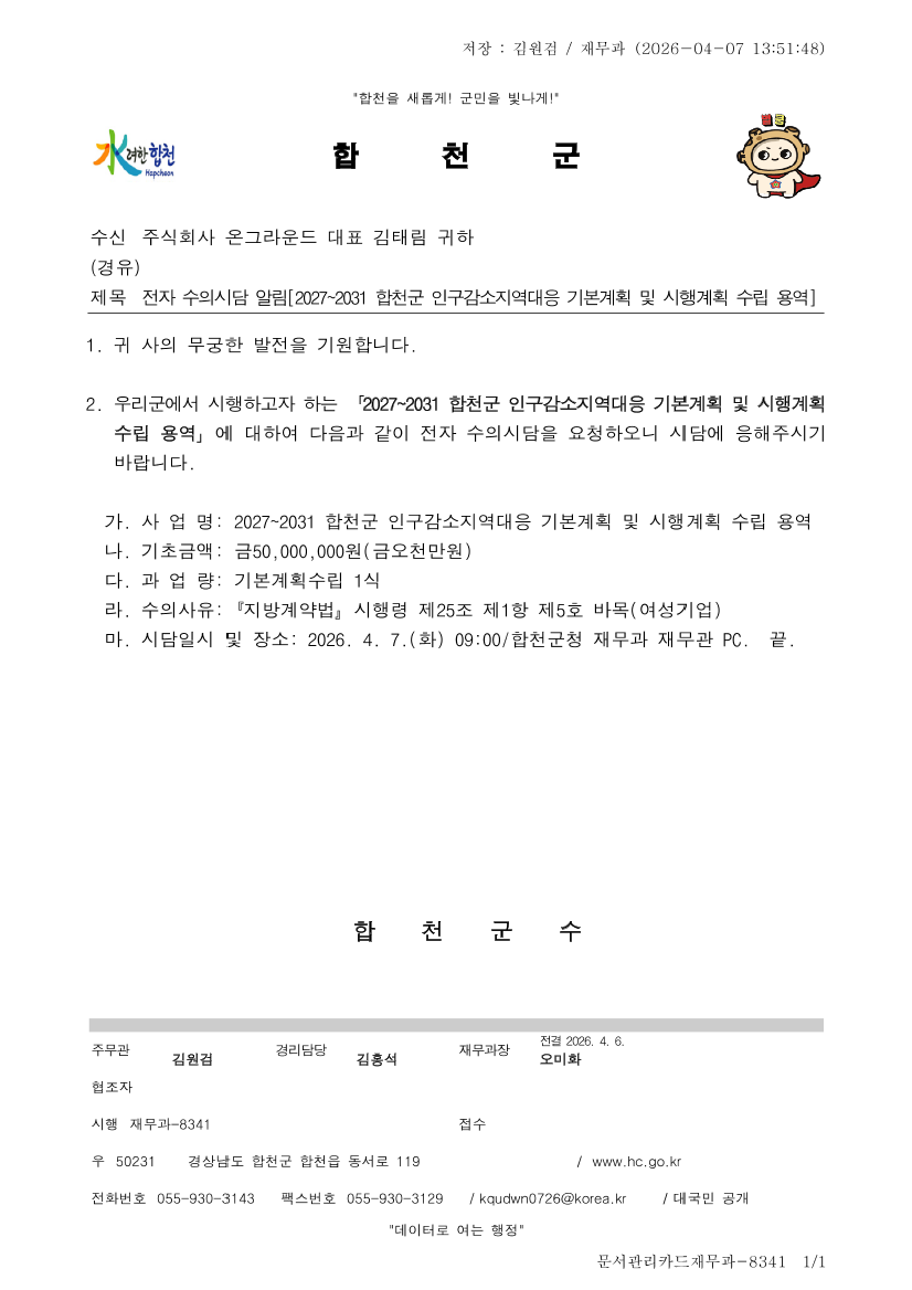 2027~2031 합천군 인구감소지역대응 기본계획 및 시행계획 수립 용역 |