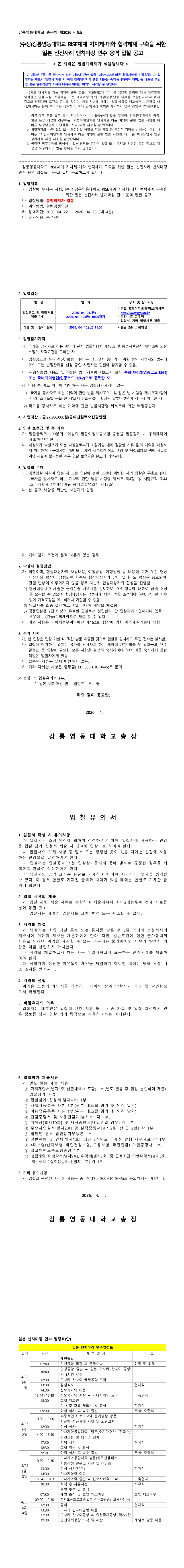 강릉영동대학교 RISE체계 지자체-대학 협력체계 구축을 위한 일본 선진사례 벤치마킹 연수 용역 입찰 공고 |