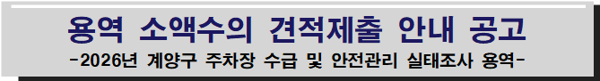 『2026년 계양구 주차장 수급 및 안전관리 실태조사 용역』 계약을 위하여 「지방자치단체를 당사자로 하는 계약에 관한 법률」 제10조 및 같은법 시행령 제30조, 지방자치단체 입찰 및 계약집행기준의 규정에 따라 아래와 같이 소액수의 견적제출 안내를 공고합니다.