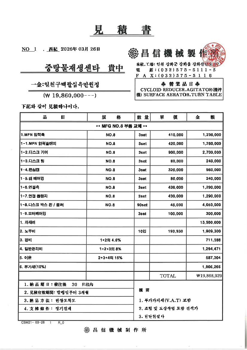 총인처리시설 급속 혼화 교반기(M-1004) 구동부 감속기, 모터(B, D, E호기)수리 |