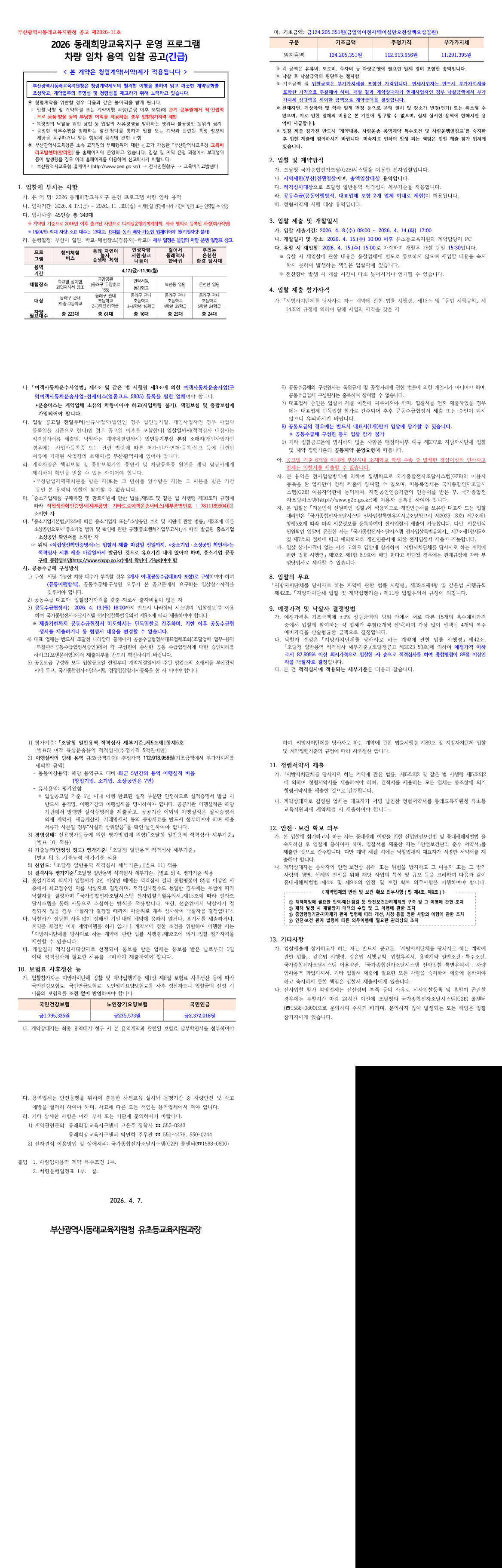 2026 동래희망교육지구 운영 프로그램 차량 임차 용역 입찰 공고(긴급) |