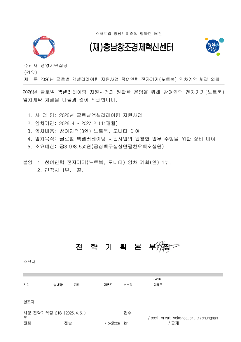 2026년 글로벌 액셀러레이팅 지원사업 참여인력 전자기기(노트북) 임차 |