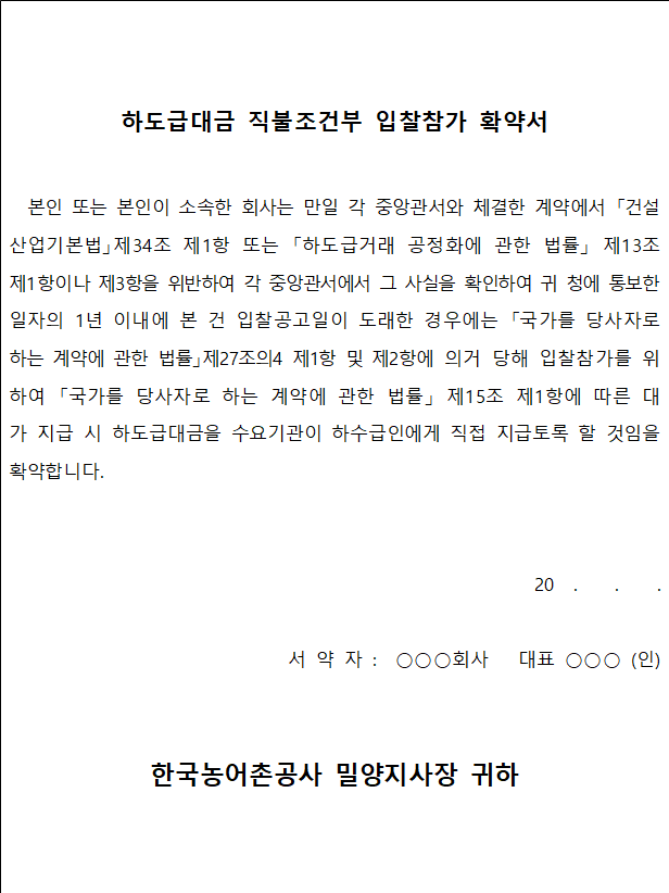 1) 입찰에 참여하는 자는 「국가를 당사자로 하는 계약에 관한 법률」 제27조의4에 따라 각 중앙관서의 장으로부터 「건설산업기본법」 제34조 제1항 또는 「하도급거래 공정화에 관한 법률」 제13조 제1항이나 제3항을 위반한 사실이 통보된 자로서 당해 입찰공고일이 위반사실 통보일로부터 1년 이내인 것으로 확인된 때에는 「같은 법」 제15조 제1항에 따른 대가지급 시 “하도급대금을 수요기관이 하수급인에게 직접 지급하는 것에 합의한다”는 내용의 확약서를 제출하여야 합니다.