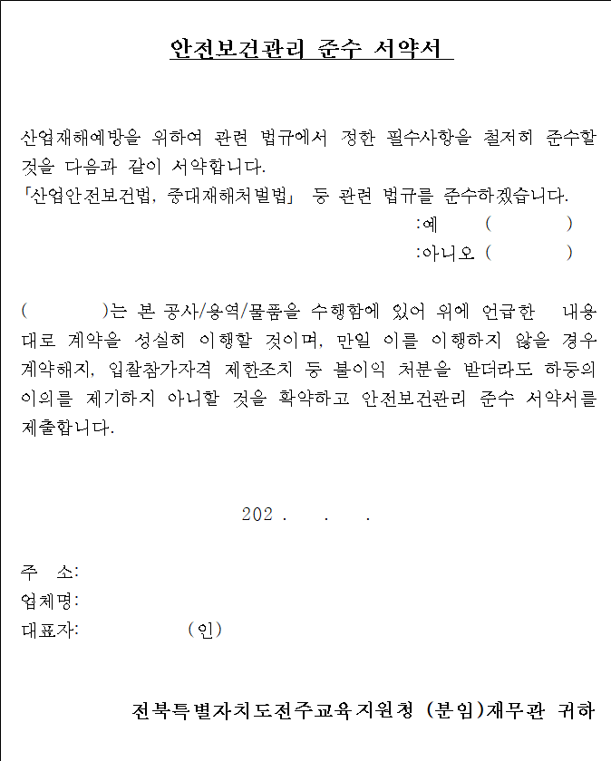 나. 입찰 참가자는 산업재해 예방을 위한 안전 및 보건에 관한 의무사항을 숙지하여 입찰에 응하여야 하며, 계약체결 시 [붙임] ‘안전보건관리 준수 서약서’를 제출하여야 합니다.
