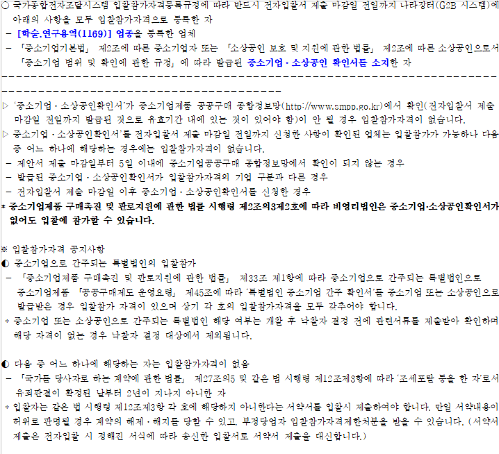 · 입찰에 참여하시기 전에반드시 공고서를 숙지하여 정확한 제한 업종을 확인하시기 바랍니다.