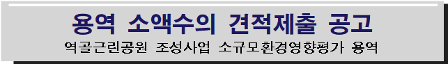 『역골근린공원 조성사업 소규모환경영향평가 용역』 계약을 위하여 「지방자치단체를 당사자로 하는 계약에 관한 법률」 제10조 및 같은 법 시행령 제30조, 지방자치단체 입찰 및 계약집행기준의 규정에 따라 붙임과 같이 수의견적 제출 안내 공고합니다.