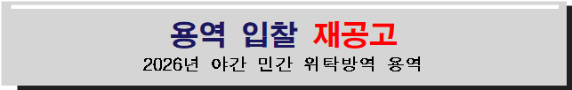『2026년 야간 민간 위탁방역 용역』 계약을 위하여 「지방자치단체를 당사자로 하는 계약에 관한 법률」 제10조 및 같은 법 시행령 제33조, 지방자치단체 입찰 및 계약집행기준의 규정에 따라 붙임과 같이 입찰 재공고합니다.