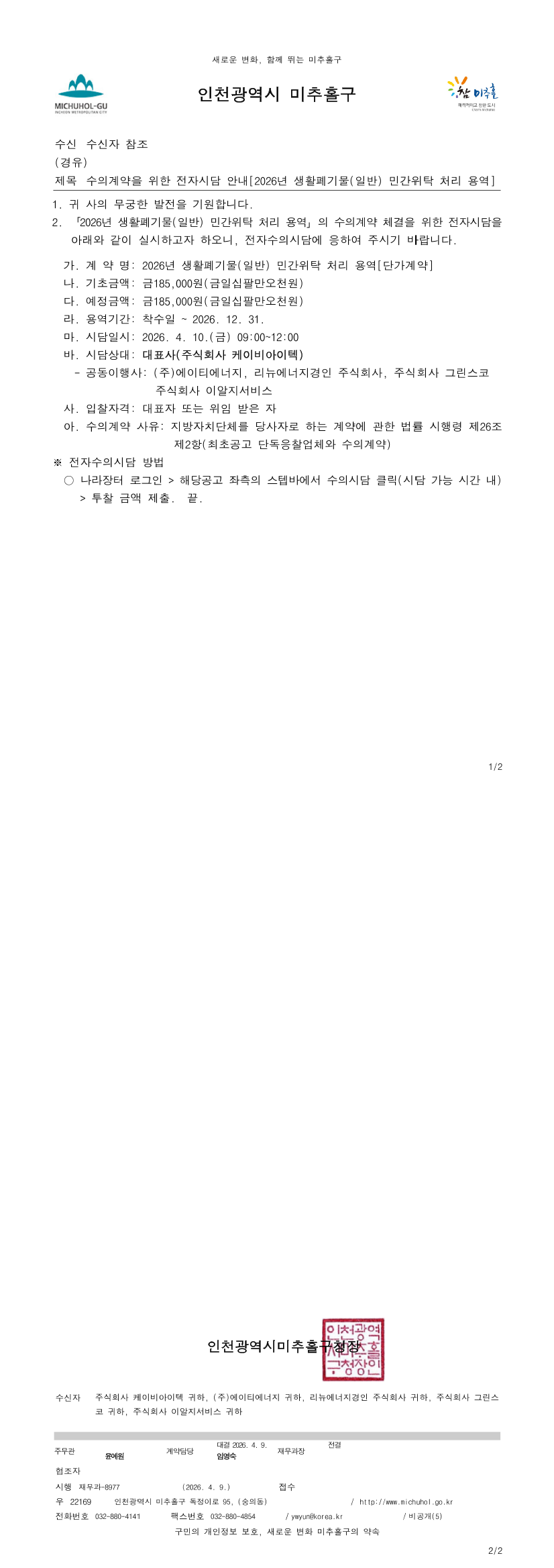 2026년 생활폐기물(일반) 민간위탁 처리 용역[단가계약](수의시담) |