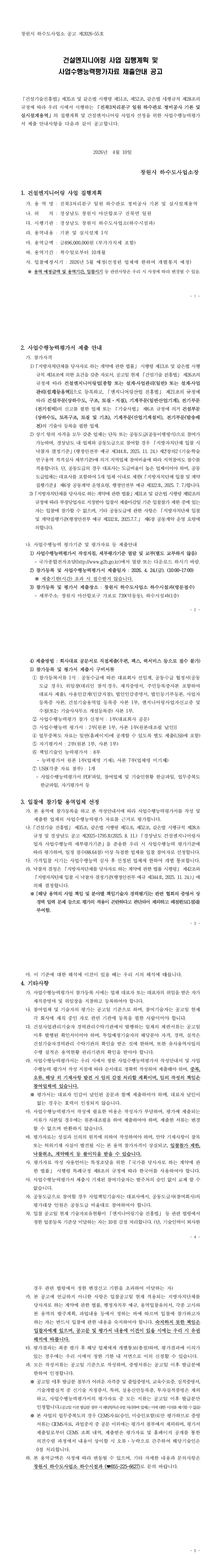 건설엔지니어링 사업 집행계획 및 사업수행능력평가자료 제출안내 공고(진북3처리분구 일원 하수관로 정비공사 기본 및 실시설계용역) |