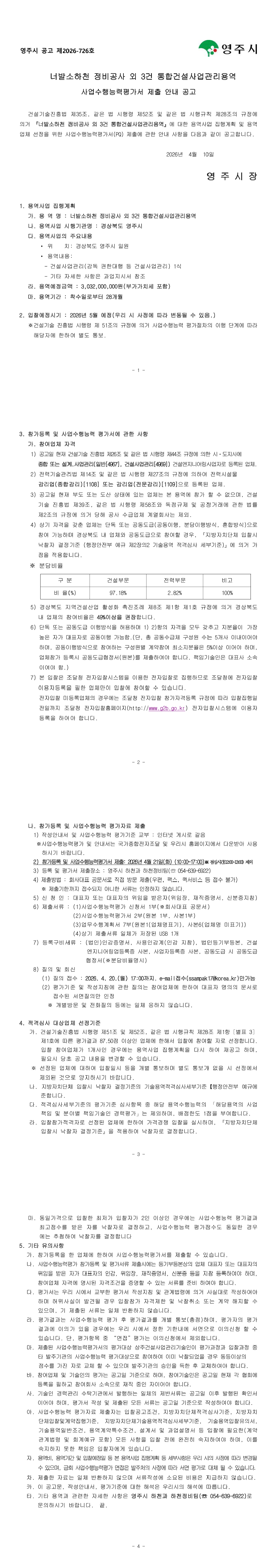 [사업수행능력평가서 제출 안내] 너발소하천 정비공사 외 3건 통합건설사업관리 용역 |