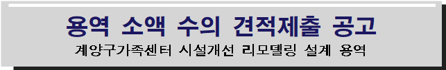 『계양구가족센터 시설개선 리모델링 설계 용역』계약을 위하여 「지방자치단체를 당사자로 하는 계약에 관한 법률」제10조 및 같은 법 시행령 제30조, 지방자치단체 입찰 및 계약집행기준의 규정에 따라 붙임과 같이 수의견적 제출 안내 공고합니다.