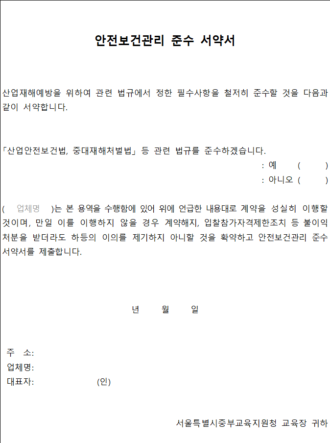 나. 본 입찰(견적서 제출)에 참가하고자 하는 자는 중대재해 예방을 위한 「안전보건관리 준수 서약서」를 숙지하신 후 입찰에 응하여야 하며, 입찰서를 제출한 자는 「안전보건관리 준수 서약서」를 제출한 것으로 간주합니다. 다만, 계약 체결 후 착수계 제출 시 업체 대표자가 서명한 서약서, 안전보건관리계획서 등을 제출해야 합니다.