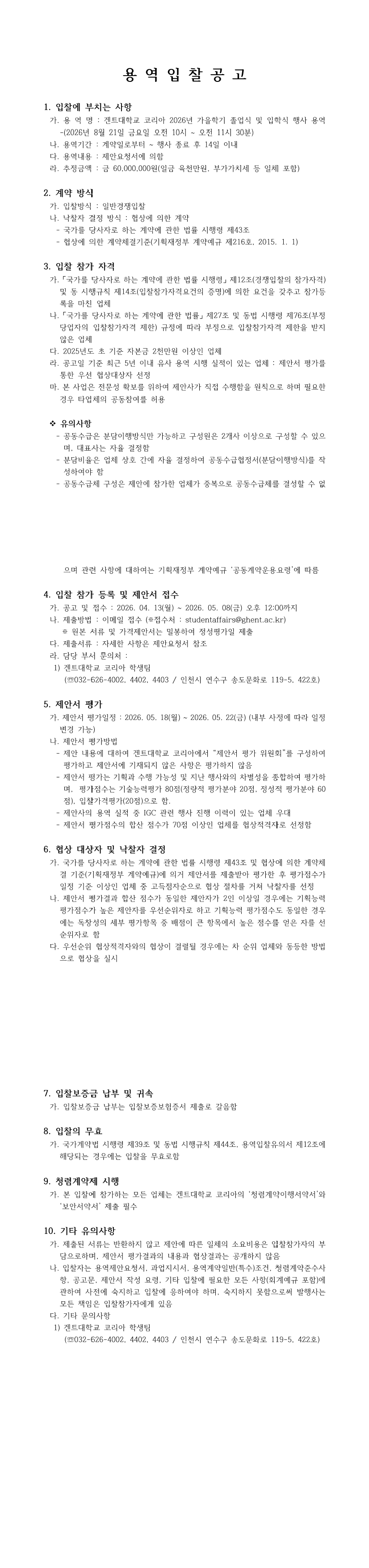 겐트대학교 코리아 2026년 가을학기 졸업식 및 입학식 행사 용역 |