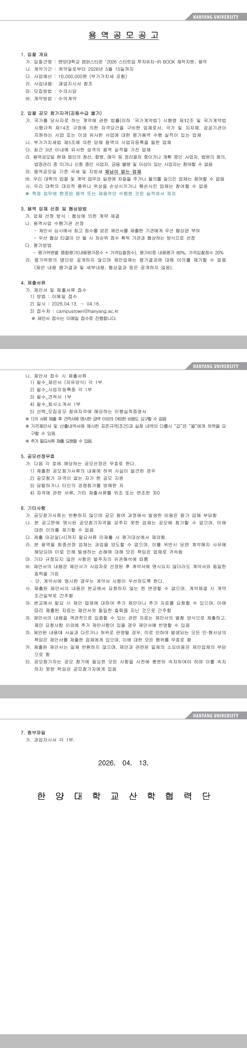 한양대학교 캠퍼스타운 「2026 스타트업 투자유치 - IR BOOK 제작지원」용역 |