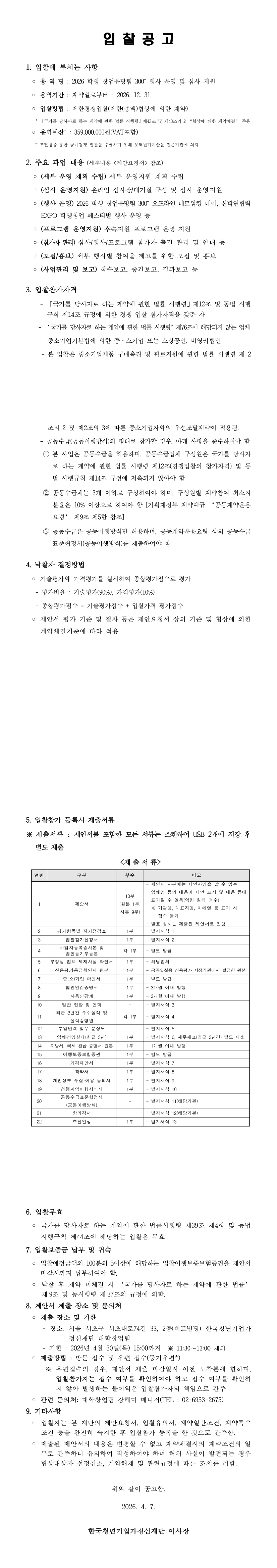 2026 학생 창업유망팀 300+ 행사 운영 및 심사 지원 운영 용역 |