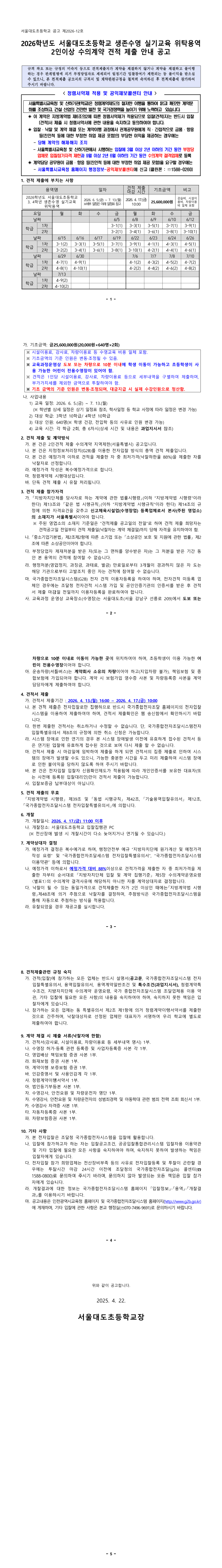 2026학년도 서울대도초 3,4학년 생존수영 실기교육 위탁용역 |