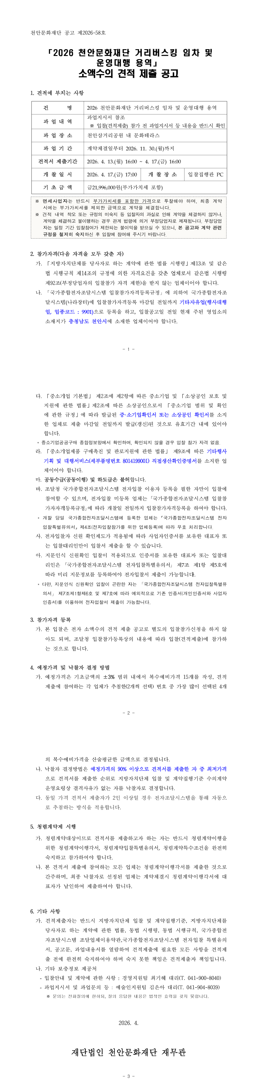 2026 천안문화재단 거리버스킹 임차 및 운영대행 용역 |