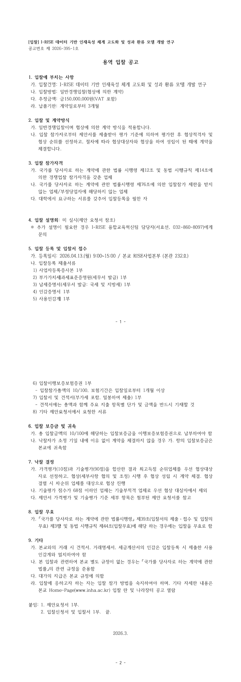 [재공고] 인하대학교 I-RISE 데이터 기반 인재육성 체계 고도화 및 성과 환류 모델 개발 연구 용역 |