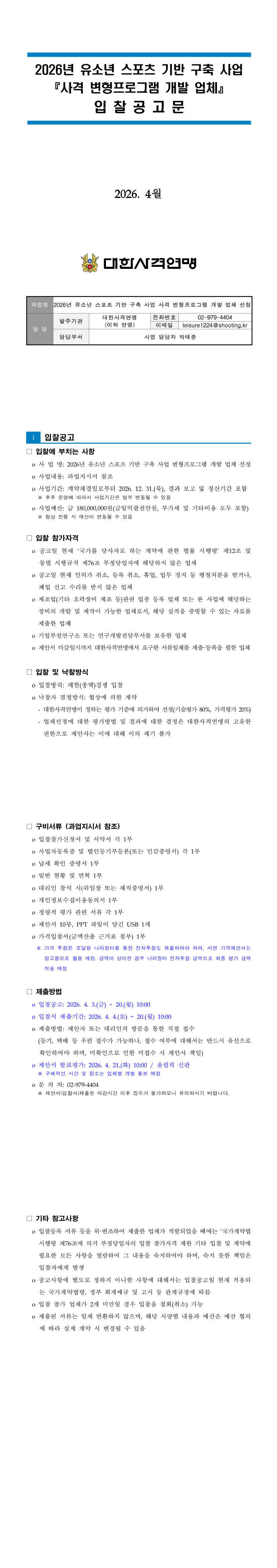 2026년 유소년 스포츠 기반 구축 사업 사격 변형프로그램 개발 업체 선정 |