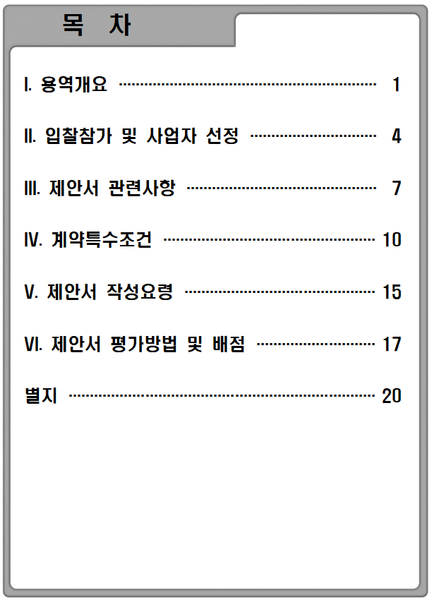 ? 제안서의 구성 및 목차는 가능한 한 제안서 작성지침의 순서 및 목차에 의해 작성하여야 하며, 증빙과 관련된 자료 및 참고문헌 목록은 제안서와 별도로 제출하되 본문에 참조 가능한 인덱스를 표기하여야 함