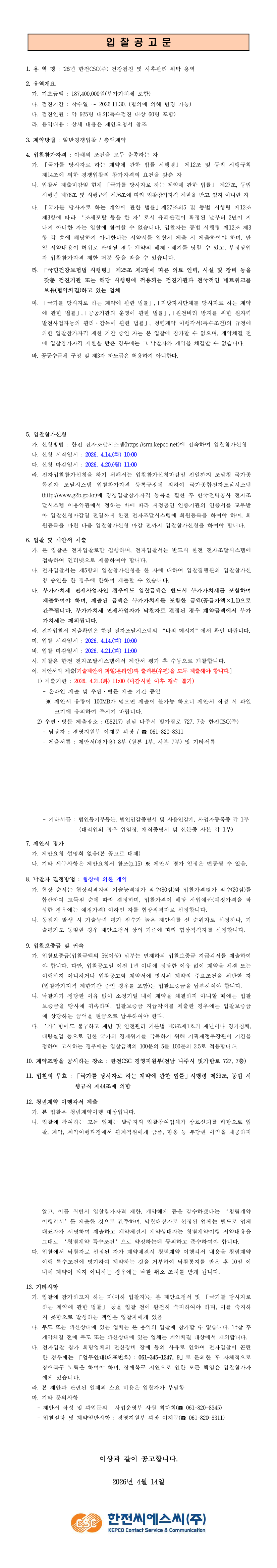 '26년 한전CSC(주) 건강검진 및 사후관리 위탁 용역 |
