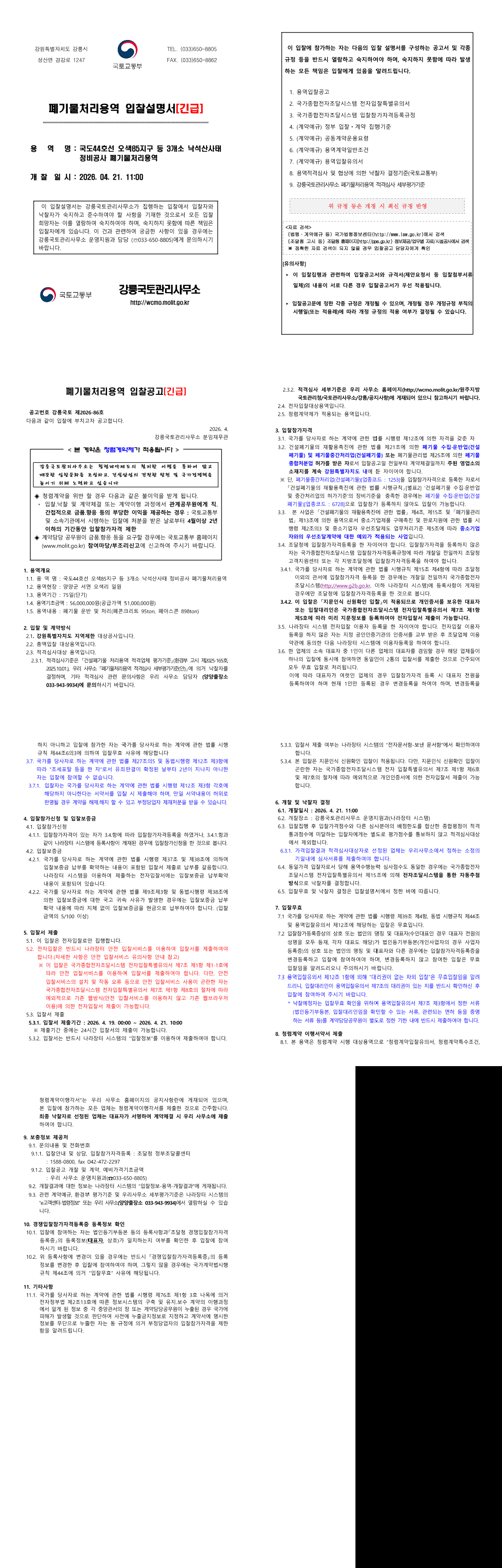 국도44호선 오색85지구 등 3개소 낙석산사태 정비공사 폐기물처리용역 |