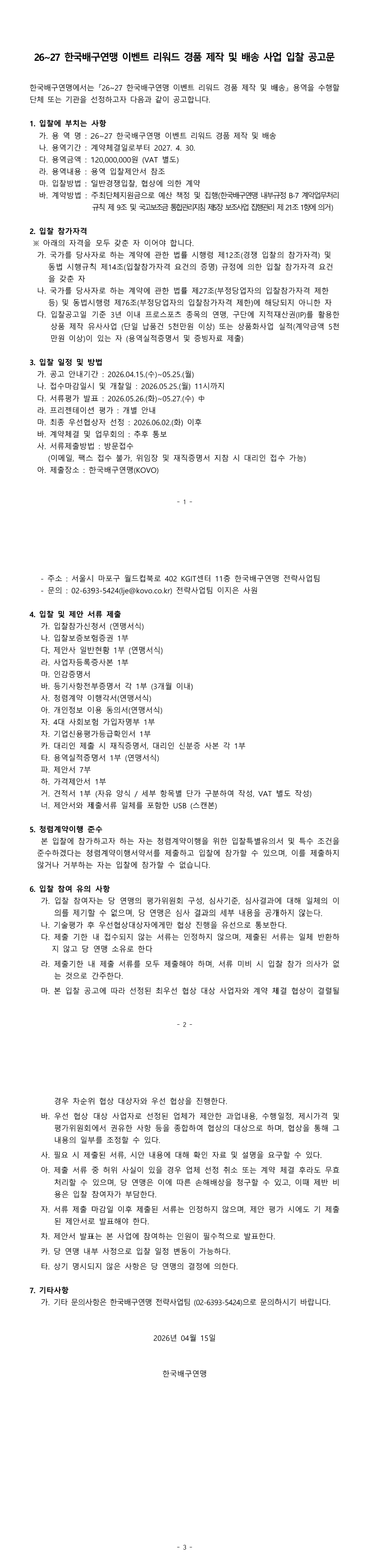 26~27 한국배구연맹 이벤트 리워드 경품 제작 및 배송 사업 |