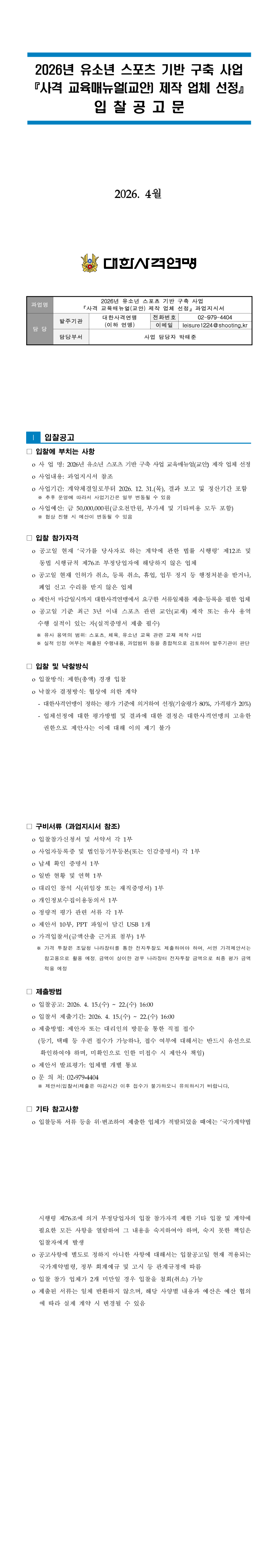 2026년 유소년 스포츠 기반 구축 사업 사격 교육매뉴얼(교안) 제작 업체 선정 |